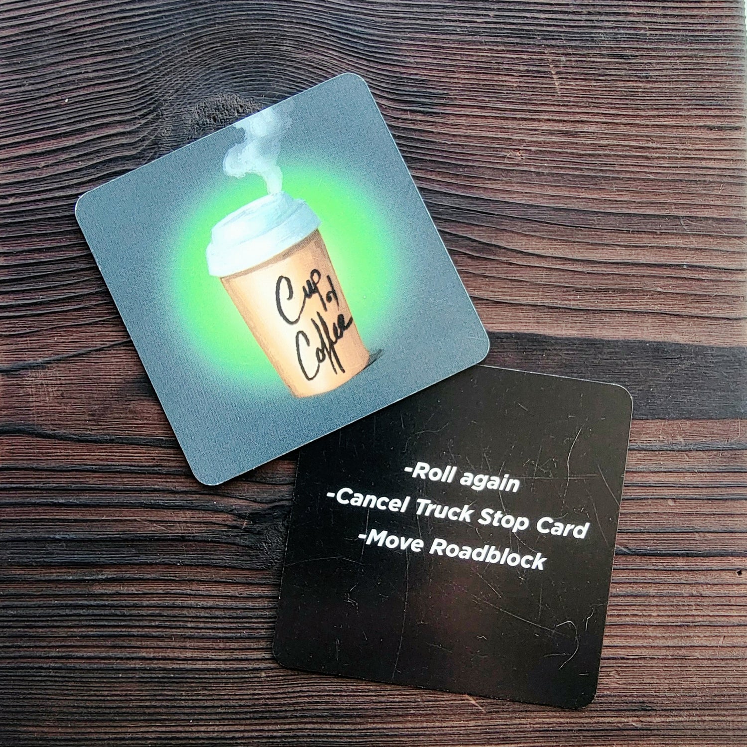 Use the Cup of Coffee Card to negate a penalty from a Truck Stop card, move a Roadblock, or roll again! Choose wisely -- you only have one!
