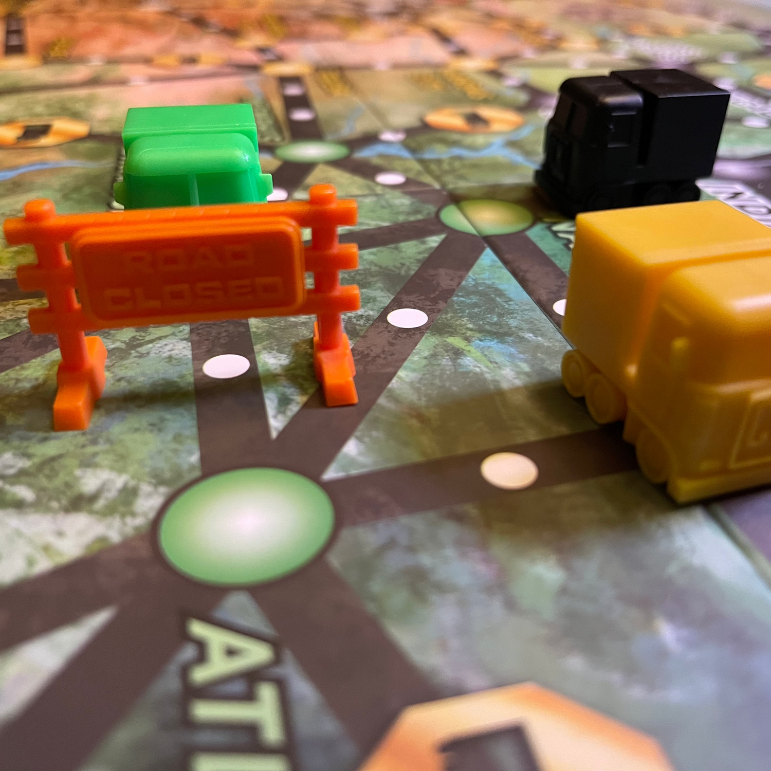 Watch out for Road Closed! The Roadblock prohibits truck movement through its location on the map. Strategically place this on your opponent's route and outmaneuver them!