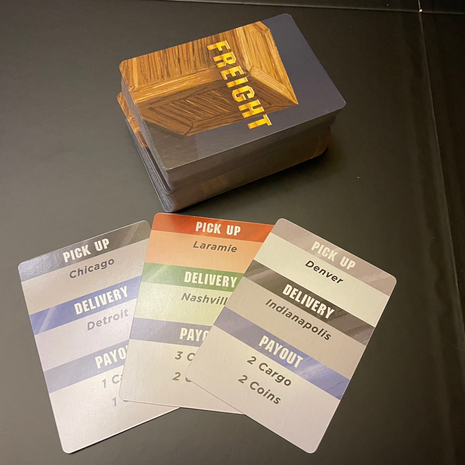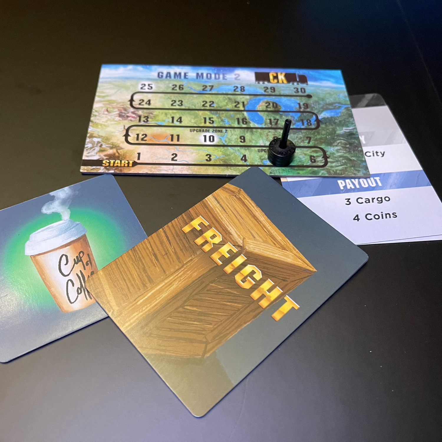 Score points by fulfilling Freight Cards and receiving the delivery's Payout. Cargo is represented on the player's Score Card with a Scoring Marker. Coins are used to purchase additional Freight Cards.